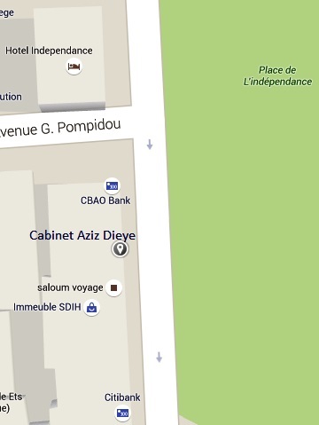 2,place de l'indépendance immeuble SDIH Bp 188 Dakar Sénégal Tel.: (221) 33 821 85 88 / 33 822 30 24 / 33 821 86 71 Fax : (221)33 821 75 94 Email:cabinetazizdiey@cabinetazizdiey.sn |